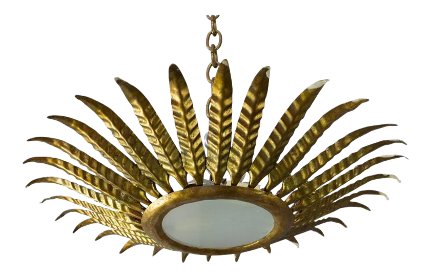 Mid Century Spanish Sunburst Gilt Crown Ceiling Fixture For Sale